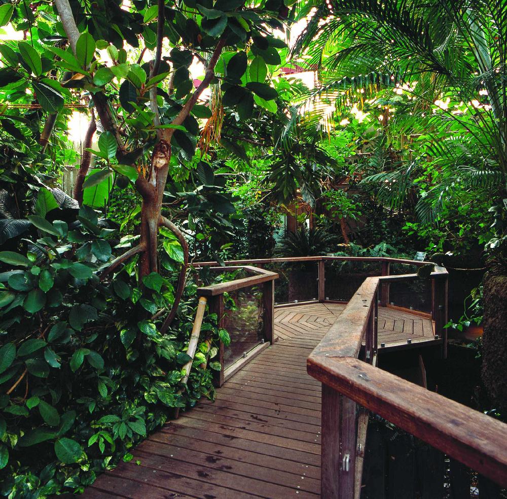 Der interaktive Info-Terminal befindet sich am Eingang der Tropenhalle und hält Informationen über mehr als 20 tropische Pflanzen- und 10 Tierarten der Tropenhalle bereit. Zahlreiche Bilder illustrieren die Besonderheiten der tierischen und pflanzlichen Bewohner des rund 440 Quadratmeter großen Regenwaldareals in Düsseldorf.