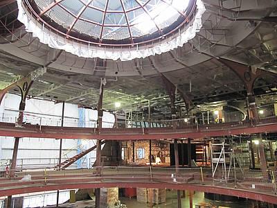 Hier unter der Kuppel, in schwindelerregender Höhe, werden Akrobaten des AIDA Showensembles in wenigen Monaten am Trapez ihre atemberaubenden Kunststücke darbieten. Während Artisten unter der gläsernen Kuppel fliegen, bewegen sich Tänzer und Gesangssolisten etwa 10 Meter weiter unten auf den Bühnen des Theatriums. Diese verändern sich wie von Geisterhand. Denn die Bühnen-Elemente sind alle hydraulisch versenkbar, mal fährt ein Piano nach oben, mal verschwinden drei Tänzerinnen nach unten.
